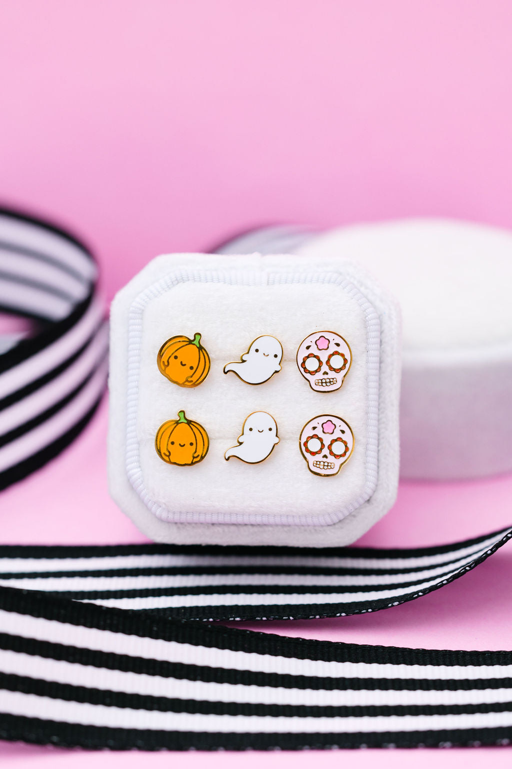 Treat yourself or your little goblins to a pair of our ultra comfy, hypoallergenic flat back studs this spooky season!